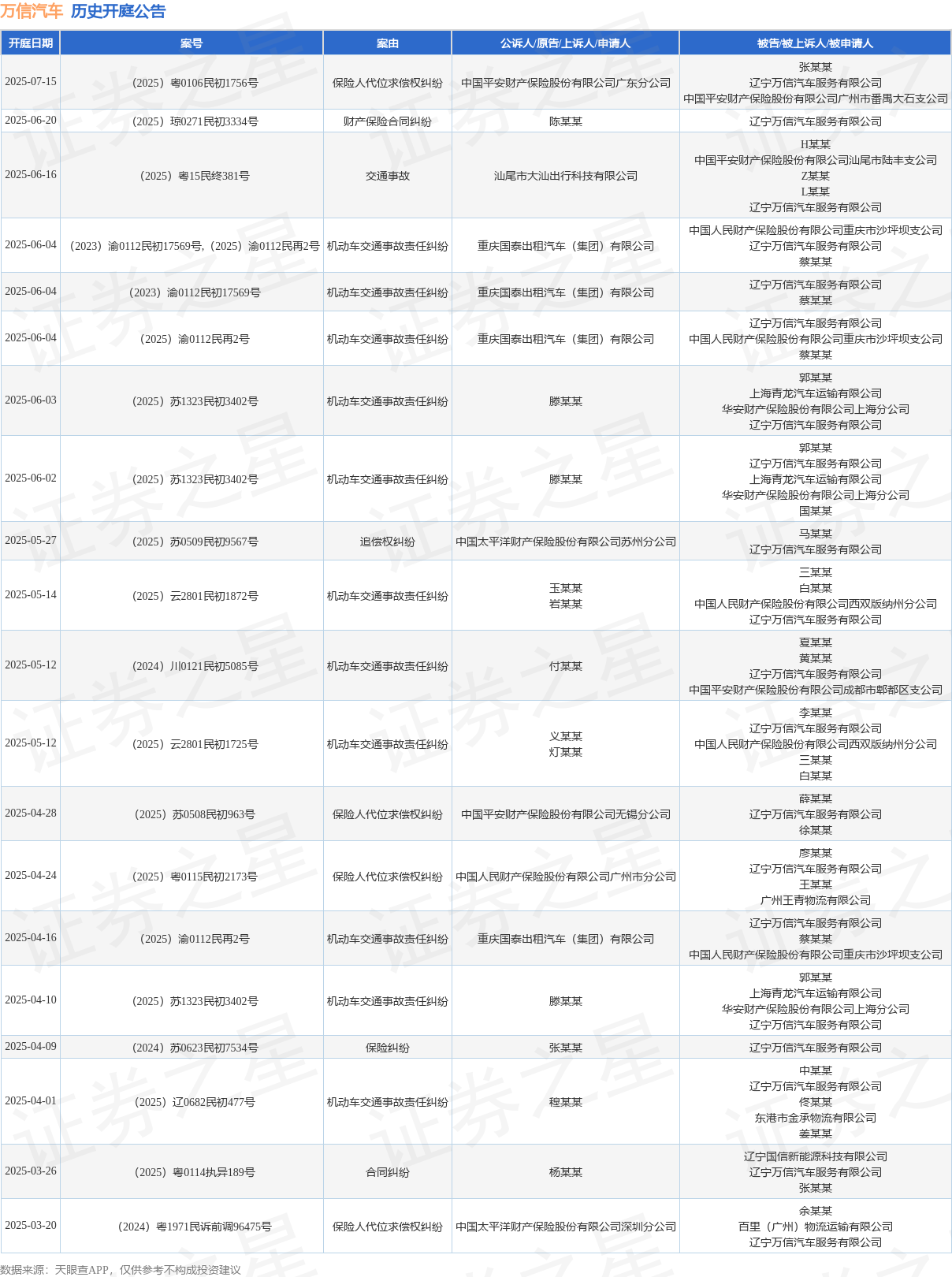 案号:(2025)云2801民初1872号审理法院:景洪市人民法院案由:机动车交通事故责任纠纷当事人信息: 原告/上诉人:玉某某、岩某某 被告/被上诉人:三某某、白某某、中国人民财产保险股份有限公司西双版纳州分公司、辽宁万信汽车服务有限公司开庭日期:2025年5月14日根据统计,近一年内以辽宁万信汽车服务有限公司为当事人的历史开庭公告有172则,其中案由为“机动车交通事故责任纠纷”的公告以77则居首,其次为“保险人代位求偿权纠纷”有26则,“财产保险合同纠纷”有22则。历史开庭公告(前20条)如下: